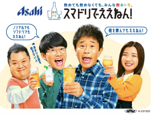 CMでは、ダウンタウンの浜田雅功さんやブラックマヨネーズの小杉竜一さん、その他の吉本興業の芸人の方々が出演し、ウルフルズの楽曲「ええねん」の替え歌に合わせて「スマドリがええねん! 合間ノンアルええねん」などと歌い、この多様な飲み方をコミカルに歌っています。